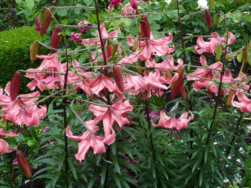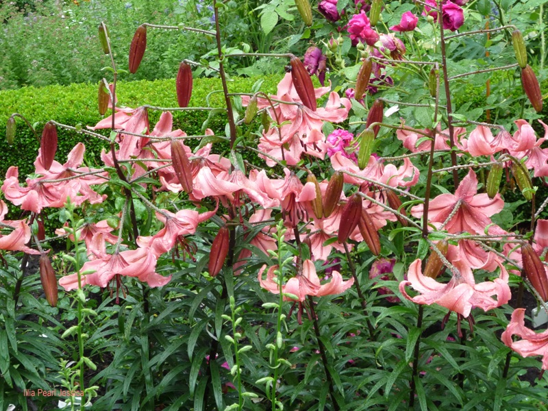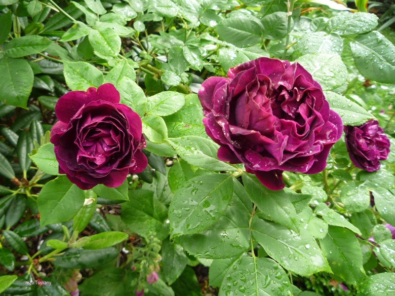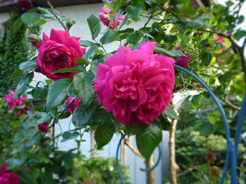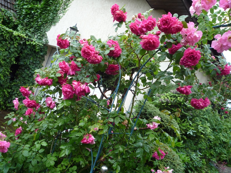 Rose de Tolbiac i Perennial Blue-fajny duecik aż pomyślałam ,że też chcę tali łuk, ale przecież obiecałam sobie ,że więcej róż nie polewkamax no i żywopłot taki elegancki wystrzyżony-pięknie Majeczko u Ciebie :hejka