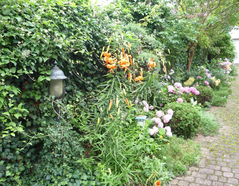 Wąski pasek ogrodu przy dojeździe do garażu .