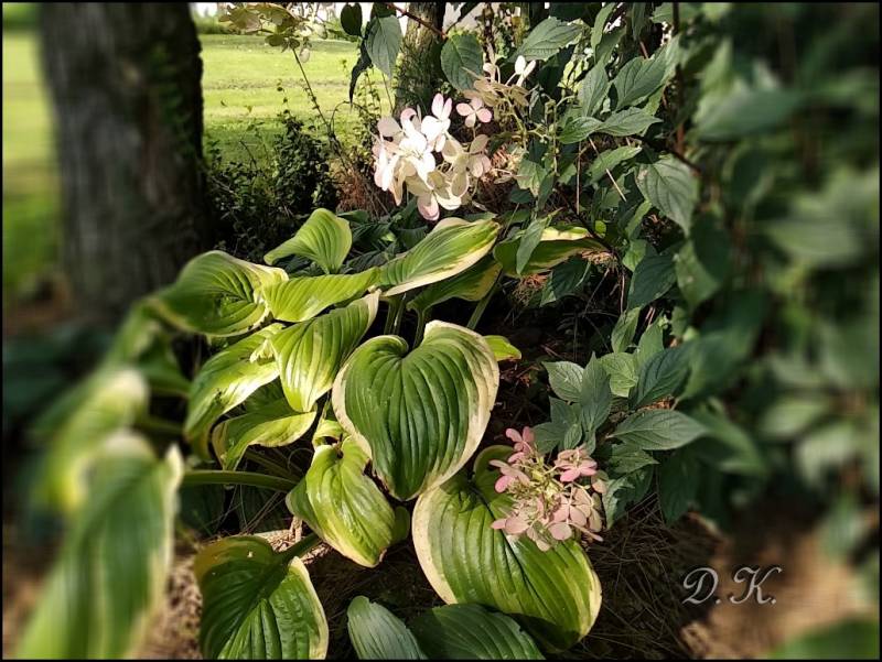 Osobną grupą są hosty. One również są ze mną od wielu lat. Ale jako liście ozdobne. Takie wypełniacze cienistych miejsc, wtedy. I co się okazało? Jak zobaczyłam w jaki sposób wypełniają te przestrzenie pod drzewami, jakie potrafią urosnąć duże w końcu jakie mają kolory, wpadłam w zachwyt. To nie są tylko wypełniacze, to wspaniała roślina, która sama może być piękna, a w grupie nadać charakter miejscu, które ciągle jakieś nijakie było.