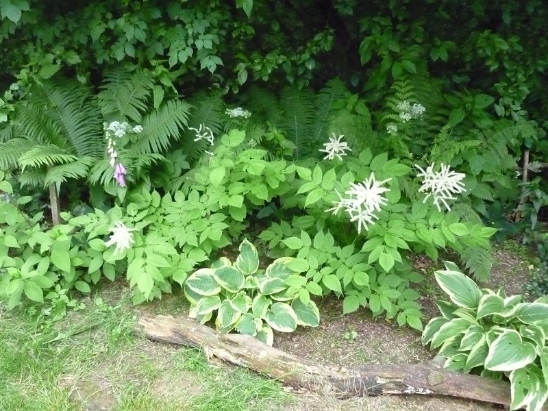 Na początku był, hmmmmm, powiedzmy, naturalny żywopłot z podagrycznika. Zaczęłam wyrywać kawałek po kawałku i tak zrobiło się miejsce na dwie podarowane hosty i trzy parzydła leśne.