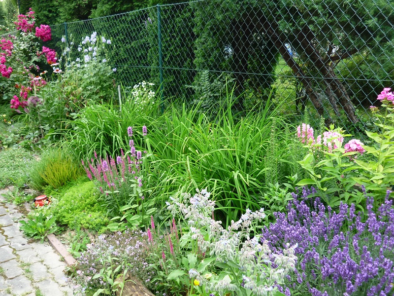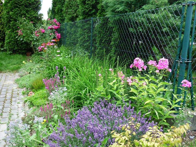 Lipiec - lawenda, przetaczniki różowe, czyściec humello i wielkokwiatowy, floksy, liatry, macierzanka, ostróżki, szałwia purpurowa, zaczynaja ogóreczniki i jeżówki purpurowe, w głębi wiesiołek missouryjski.