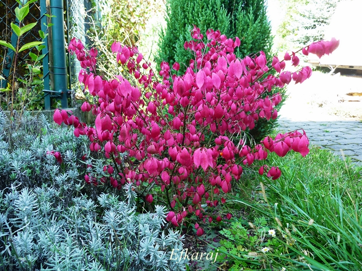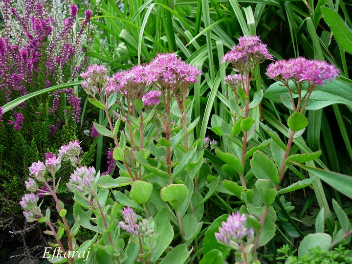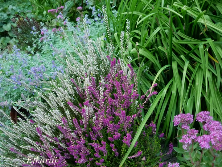 Sierpień - nie mam zdjęć całej rabatki, ale zaczynają kwitnąć rozchodniki i wrzosy, ponownie kwitnie kocimiętka, jeszcze jeżówki i floksy późniejsze i liliowce brunatno-czerwone.
