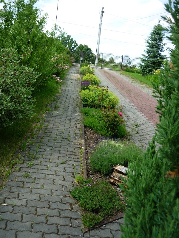 Kwiecień - już widać roślinki, które wpychają się również na chodnik. Kwitną żagwiny, gęsiówka kaukaska, żonkile, pierwiosnki, ciemiernik biały.