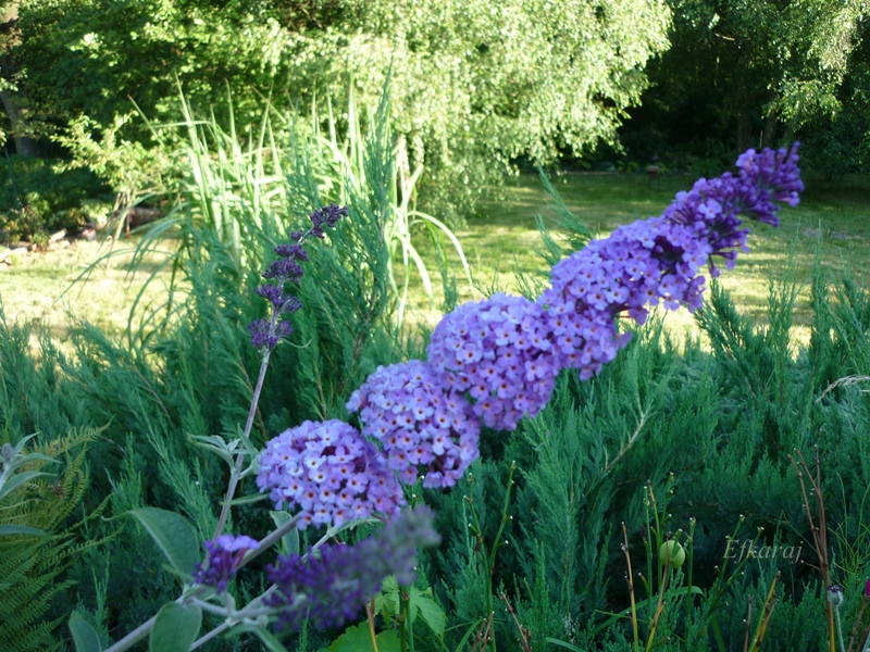 Budleja wyjątkowo pięknie kwitnie. Rośnie w bardzo suchym miejscu i cały czas w słońcu. Cień ma po godzinie 19.