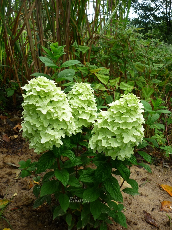 Polu, to hortensje Magical Mont Blanc, która ma stać pionowo... Niedawno ją kupiłam i mam nadzieję, że w przyszłym roku będzie mocniejsza. Dziś położyły ją padające co noc deszcze. Druga, to Polar Bear, dziewczyny pisza, że po trzech latach zaczyna się prostować... u mnie chyba jej zejdzie dłużej...Za to Magical Candle stoi jak żołnierz na baczność.