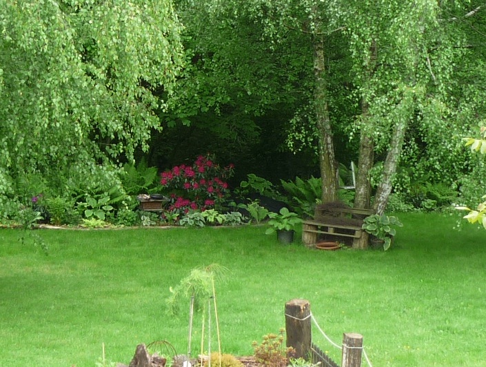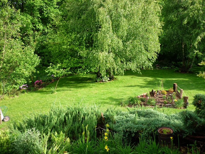 Wciąż pada deszcz... pod rodkami już jest strumyk... ale trawnik/chwastnik śliczny, zielony