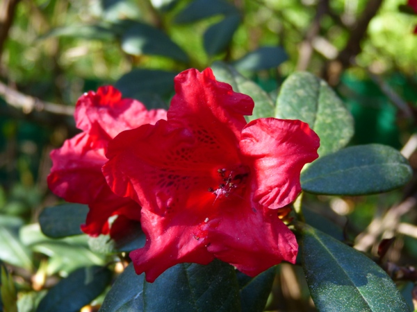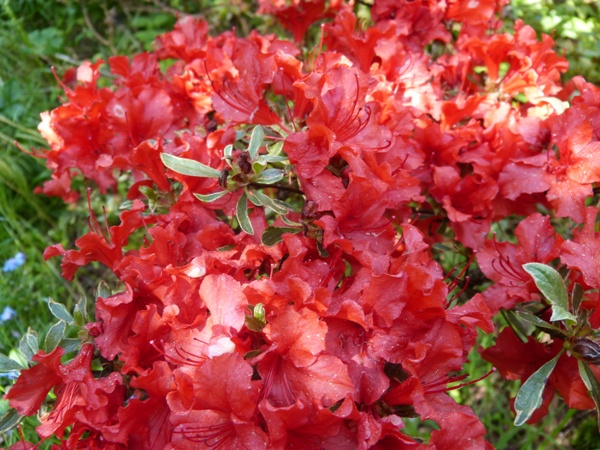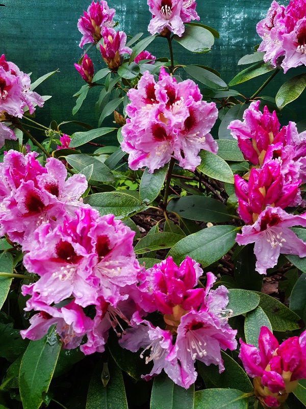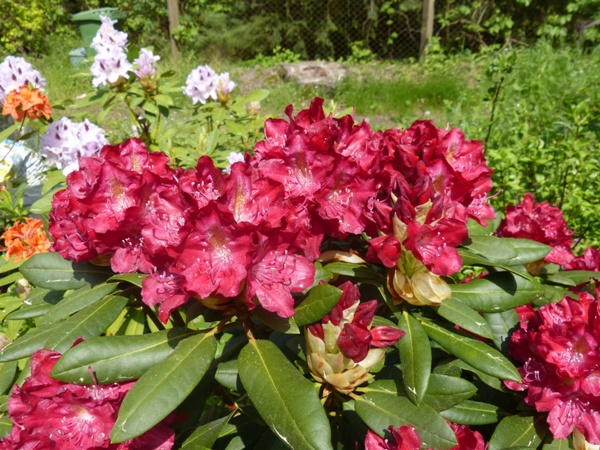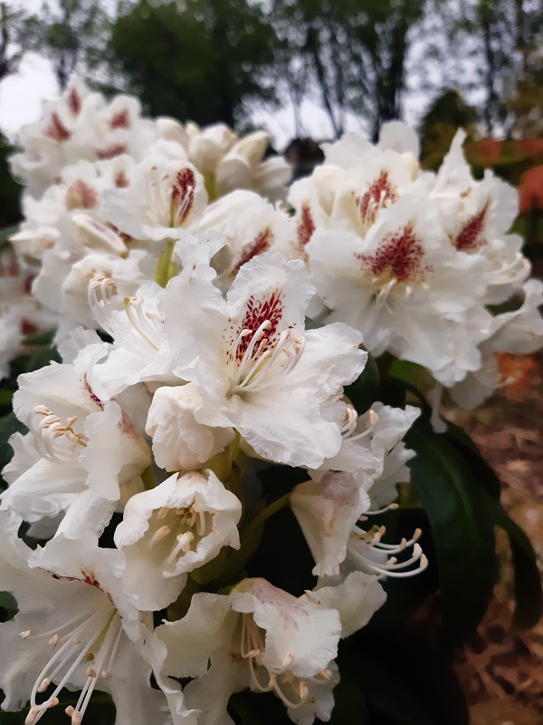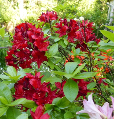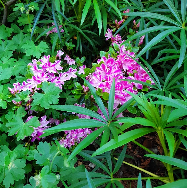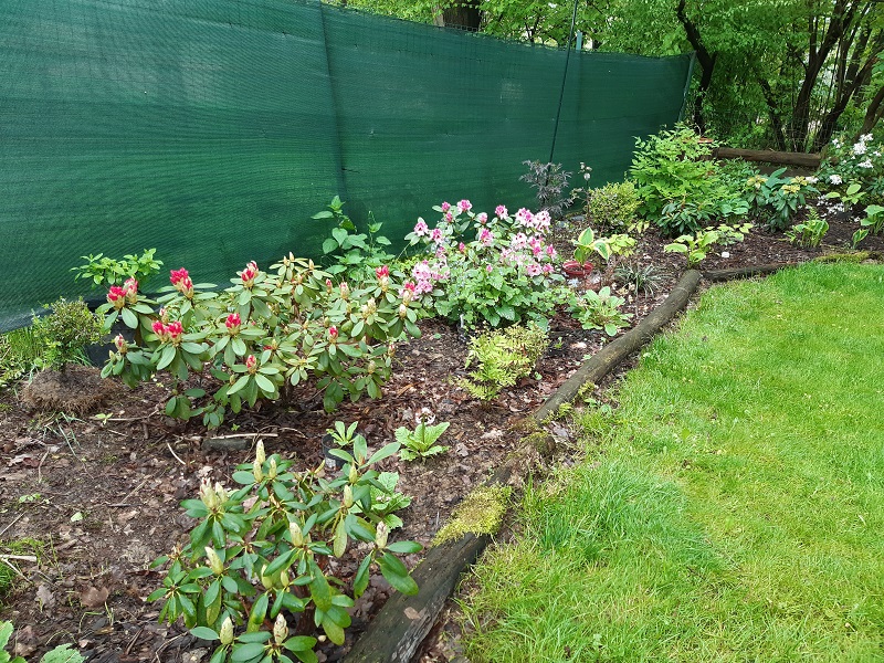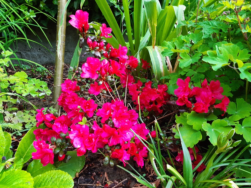 Rozwinęła się azalia wielkokwiatowa 'Persil', wtóruje jej piwonia majowa i kwiatnący nadal wrzosiec drzewiasty