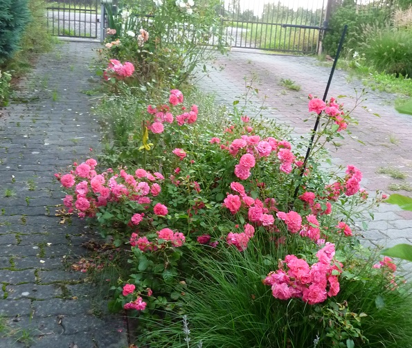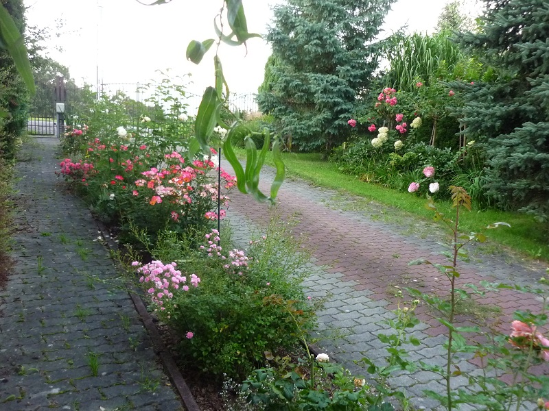 Przed domem kwitną róże. Maja oczywiście dużo mniej kwiatów niż w czerwcu i lipcu, ale jeszcze są bardzo widoczne
