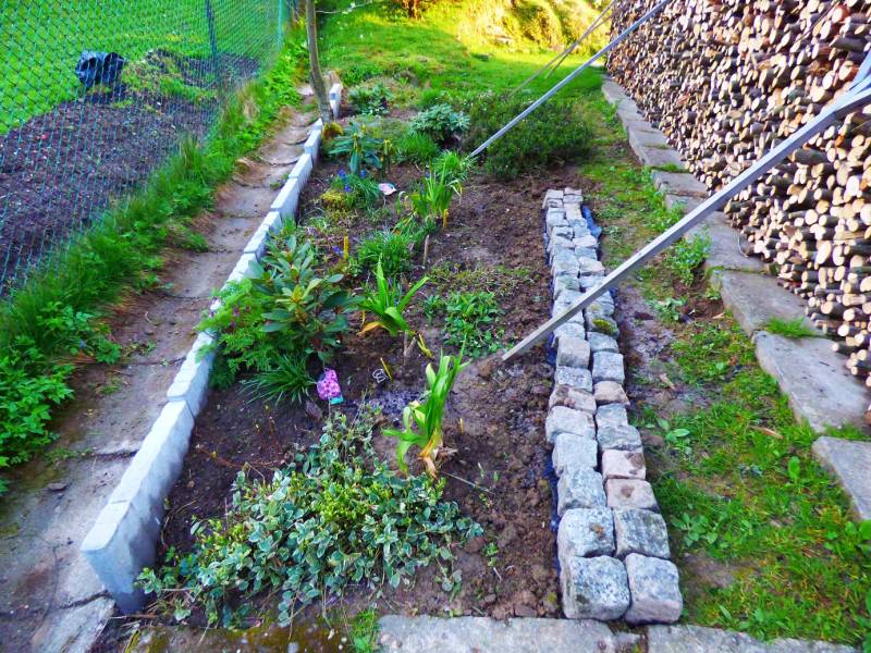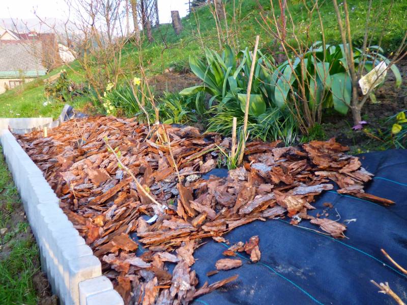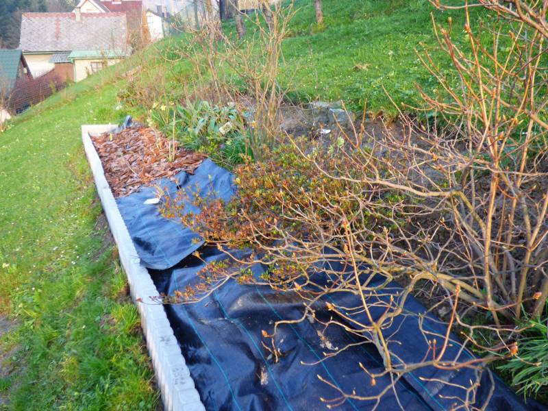 Na dzień dzisiejszy dolna połowa rabaty jest wyścielona korą,górną mamy tak samo wyłożyć palisada z betonu,włożyć tkaninę i nasypać kory,bo pielenie na skarpie mnie dobija.