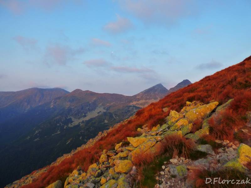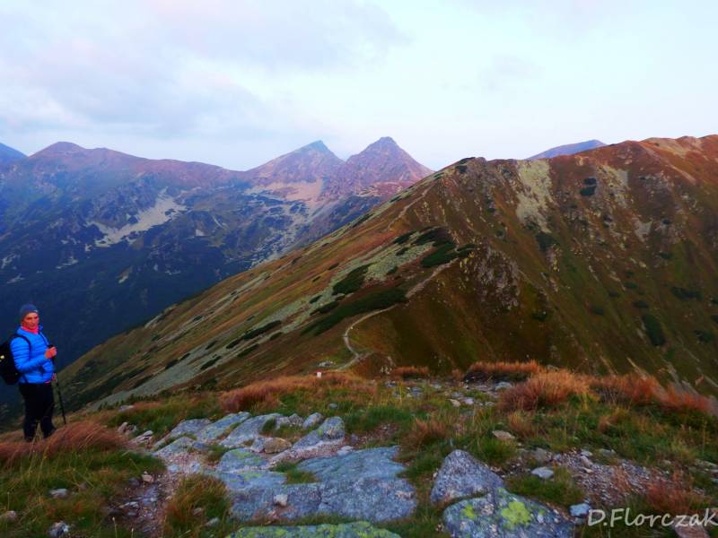Po przepięknym wschodzie o 6.10 ruszyliśmy w dalsza wędrówkę,przez Łopatę Jarząbczy został w oddali a my zdobywaliśmy kolejny dwutysięcznik Wołowiec 2064,w tle intrygował mnie słowacki Płaczliwy Rohać może go kiedyś zdobęde.Zejście z Wołowca dało mi w kość bo ból kolana się odezwał ale trzeba było zacisnąć zęby i iść dalej,potem był Rakoń i Grześ góra przypominająca naszą Babią,przepięknie kwitnące na jego zboczach wrzosy i goryczka trojeściowa gwizdac.Po słowackiej stronie ludzie zbierali rafami brusznicę :woohoo: Dziwne to że Słowacy inaczej przeszczegają praw w Tatrach a my mamy same zakazy :mur nie wolno nocą chodzić,psy tylko można zabierac do doliny Chochołowskiej,a Słowaczka pędziła z psem na Wołowiec.