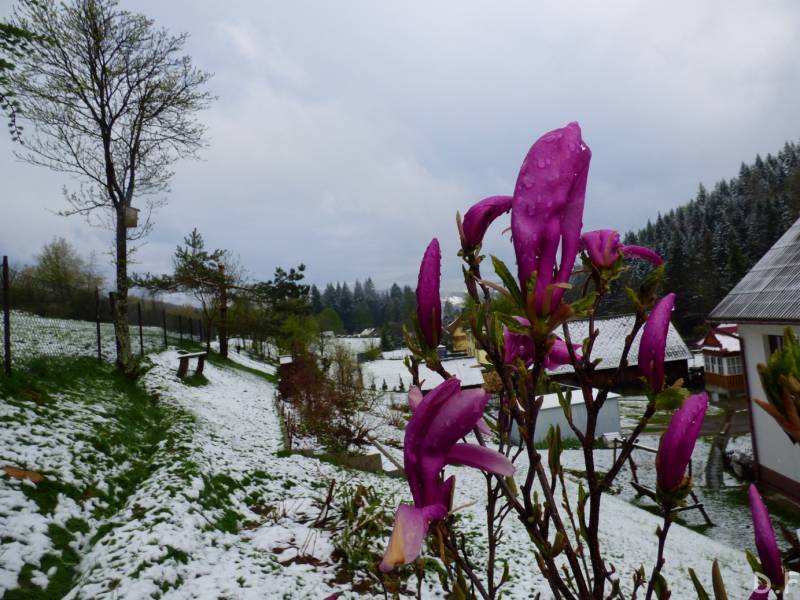 Po mimo maju,na Babiej zima zagościła na kilkanaście godzin,ale co się dziwić jak w ogrodzie miałam biało,a stado 32 łań zeszło z lasów na dół aby nie głodować.