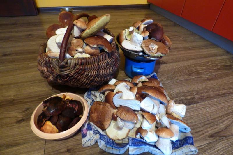 Cały dzień pochmurny tem w granicach 20 więc w sam raz na grzybobranie.Las był przewrócony do góry nogami ale i tak znalazłam 30 prawdziwków małych i średnich.Po godzinie syn z Rafałem i Pusią pojechali do domu a ja z Puszkiem i wielkim koszem który odziedziczyłam po teściowej a ona dostała w prezencie od szwagierki z Białegostoku pojemny ale bardzo ciężki,i tak sobie szłam 3