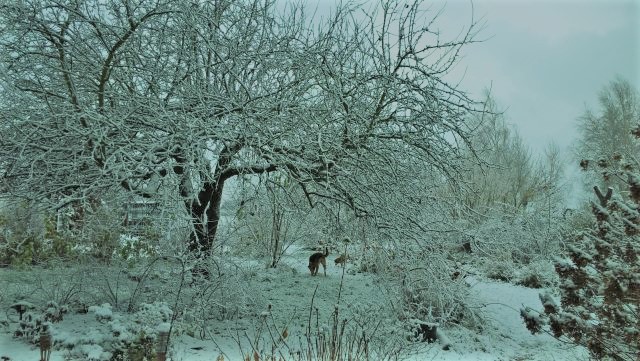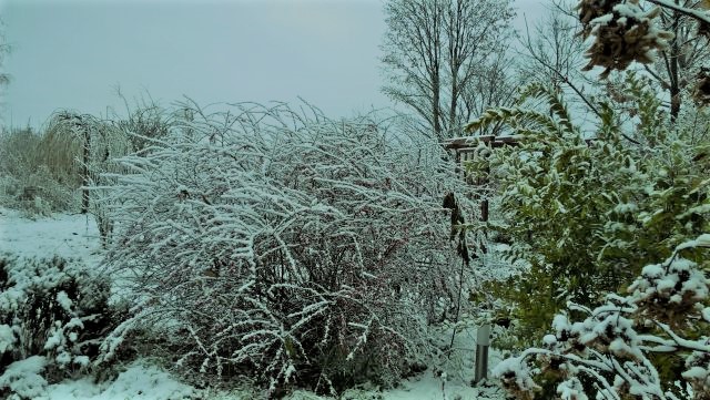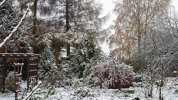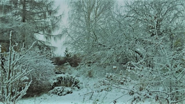Może zacznę od końca i jeszcze kilka zaśnieżonych zdjęć wstawię - tak w ogóle to w ogrodzie pozostawiliśmy stare odmiany jabłoni, orzecha włoskiego, dwa ogromne modrzewie i szpaler starych lilaków, nic więcej się nie nadawało bo były to zaniedbane szpalery starych porzeczek i leszczyn.