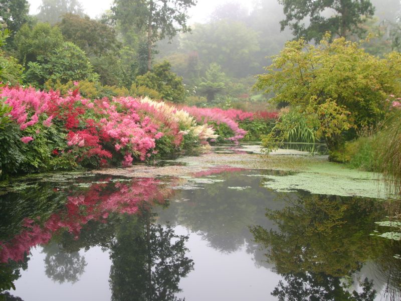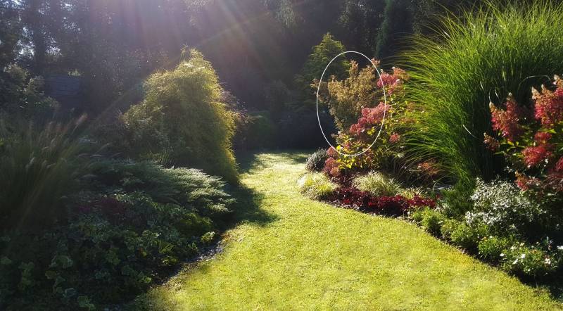 Strumyk płynie na mojej działce przed domem - teren jest nieogrodzony i grodzić go nie mam zamiaru. Jest tego wszystkiego ok. 400 m2, na górce - dość znacznej. Żeby nie deptać jęzora podczas koszenia tego zielonego czegoś (bo trawa to nie jest) teren blisko domu o największym nachyleniu, obsadziłam pod koniec wakacji głównie iglakami, wrzosami pączkowymi, i niskimi trawkami. Rabata ma blisko 30 m długości, szerokość różna zależna od fali. Wszystko wyłożyłam włókniną (choć jej nie lubię) i zasypałam korą, nie dałabym rady z plewieniem. Na tej łączce przed domem stoją dwa słupy - na jednym (bliżej rzeczki) rośnie winobluszcz, a pod drugim (tym bardziej na środku) dziki mieszaniec różany Ritausma. Żywopłotem martwi się sąsiad - muszę jedynie zapewnić dostęp do cięcia. Najlepiej byłoby nawieźć tam nowej ziemi i coś z tym zrobić. Niby proste, ale... w bliżej nieokreślonej przyszłości chcę tam zbudować przydomową oczyszczalnię ścieków. Więc gdzieś trzeba rozłożyć sączki, zapewnić dostęp aby wypompować zbiornik itd. Jedynie blisko żywopłotu można posadzić coś większego, bo na niebie nad łączką, niezbyt wysoko biegnie pajęczyna kabli. I wykombinuj tu babo coś mądrego!