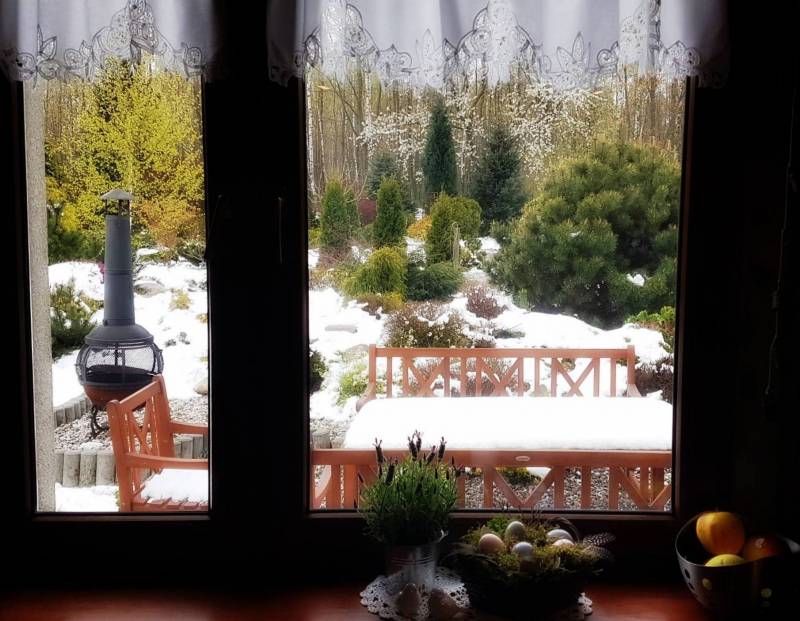 Była już taka piękna wiosna za oknem... a tu znów zima, skutecznie zamroziła moje poczynania ogrodowe. Namęczyłam się bardzo strząsając czapy mokrego okropnie ciężkiego śniegu. Niektóre gałązki połamało... brrr