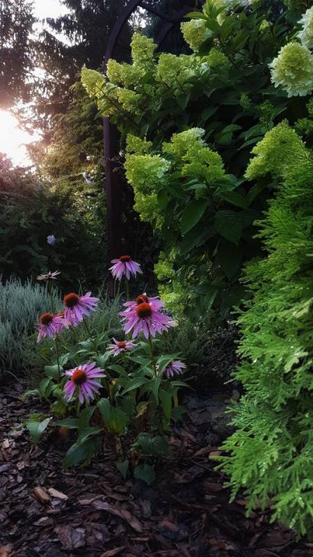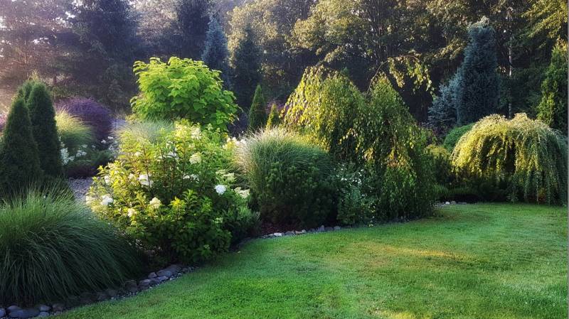 Żeby niektórym roślinkom dać trochę wytchnienia od prażącego słońca koniecznie należało dosadzić coś wyższego nad brzegiem. Wierzby stworzą ładne parasole, brzózki szczepione im pomogą, hortensje kiusiu i magical flame - ślicznie zakwitną pustymi kwiatuszkami, a sosny zrobią dobrą robotę nie tylko jako tło .
