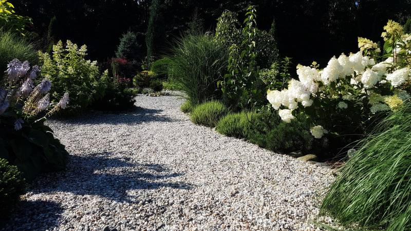 Na żwirowy taras zdecydowałam się z bardzo prozaicznego powodu - brak kasy. Miał to być etap przejściowy, ale już wiem, że nie przerobię go na nic innego. Wygląda naturalnie, komponuje się z resztą ogrodu, tani w wykonaniu, a z utrzymaniem w czystości nie mam problemów: liście z lasu aż tak daleko nie lecą, plewiąc w skarpie i tak wrzucam wszystko od razu do wora. Owszem był problem ze ścieżkami, bo tam początkowo opadłe liście wybierałam ze żwirku nie przymierzając jak Kopciuszek, ale on sobie siedział, a ja na kolanach. Sprawę rozwiązał odkurzacz do liści. Wydmuchuję liście na trawę i zgrabiam, a że trochę kory się przy okazji wydmuchnie z rabat - to już inna bajka.