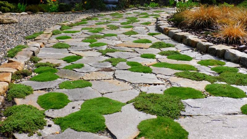 Edytko na ścieżce rośnie i karmnik i macierzanka "red carpet" wrzucam Ci fotkę, rośliny świetnie trzymają kamienie, bo u mnie kładzione tylko na piasku, a chwasty faktycznie nawet nie rosną.