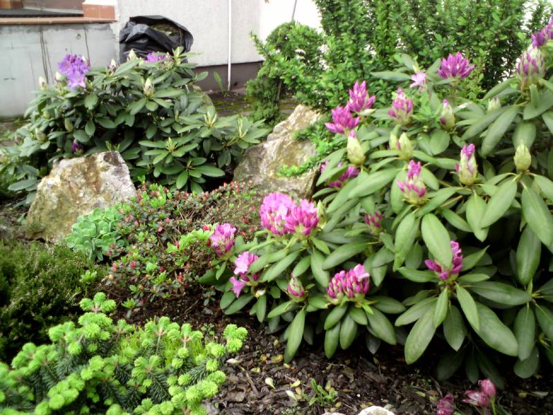 Kamieni już w ogóle nie widać. Azalii widoczna na zdjęciu już nie ma. Chyba wymarzła. U mnie azalie japońskie bardzo słabo rosną. Dopiero kupione po konsultacji z Poll Orlice i Madame van Hecke dały radę.