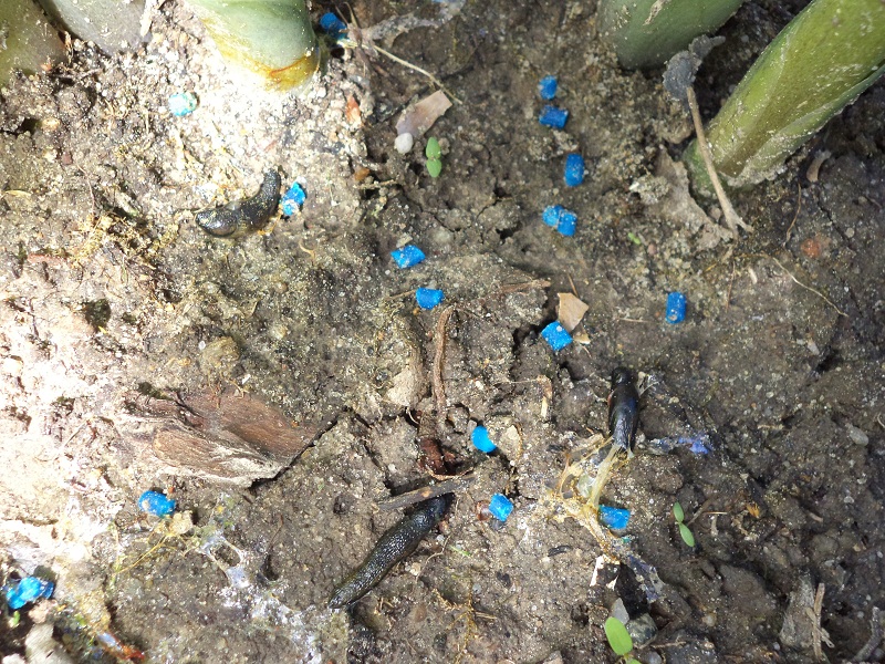 Na rabacie przy hostach i żurawkach znalazłam pełno małych, czarnych ślimaków, je też posądzałam o zżeranie jednych i drugich, dlatego w desperacji wszędzie zaczęłam sypać niebieskie granulki