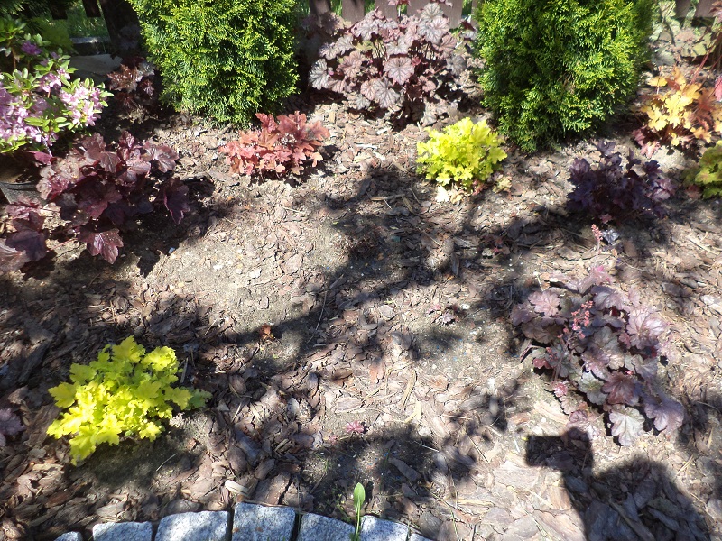 Żurawkami wypełniłam luki powstałe po przeniesieniu host. Na rabacie pozostały tylko niskie iglaki i żurawki.