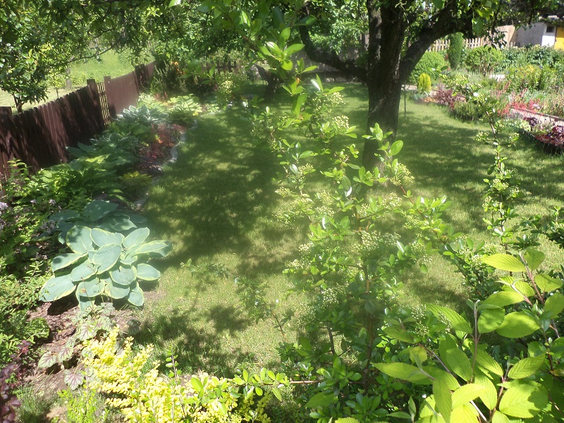 Postanowiłam więc, że w przyszłym roku część funkii, tylko może innych, bardziej odpornych na słońce, wróci na tą rabatę. Zaś hostom na nowej rabacie dołożę kolorowe żurawki i szary kamień, clap Wyszło lepiej, ale ciągle przeszkadzała mi