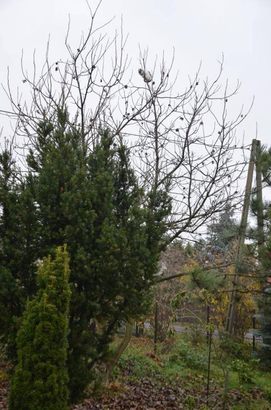 Kotek za nic nie chciał zejść. Próbowaliśmy go zdjąć ale jeszcze bardziej się przestraszył. Drzewo jednak duże a on siedział bardzo wysoko. Pomyśleliśmy, że raczej sam zejdzie jak tylko zrobi się ciemno i będzie wiedział, że nic już mu nie grozi.