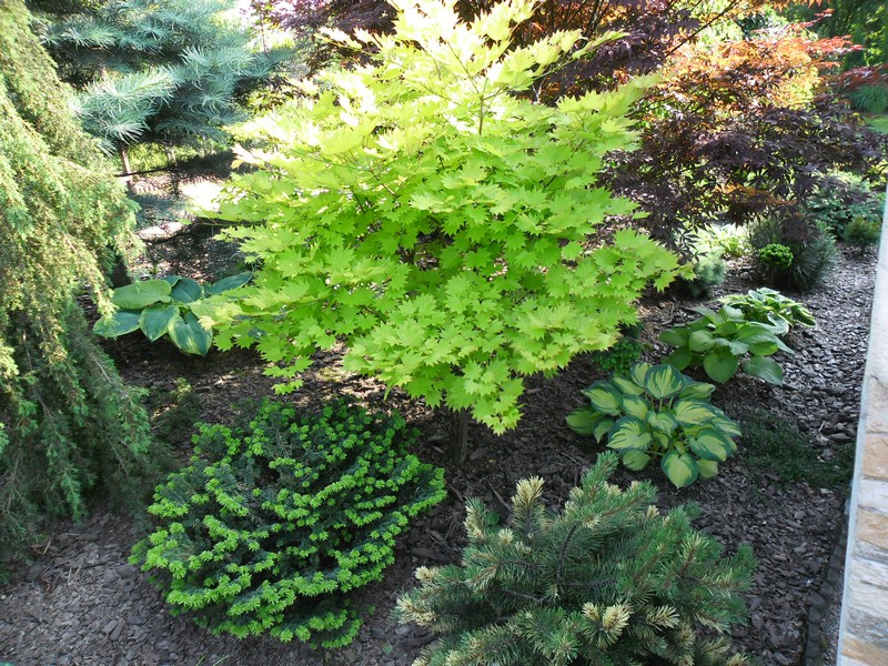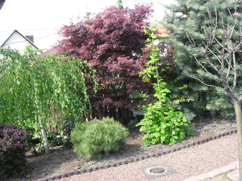 Nie jest to miejsce obsypane kwiatami,królują w nim iglaki,klony,drzewa liściaste i moje ukochane hosty.