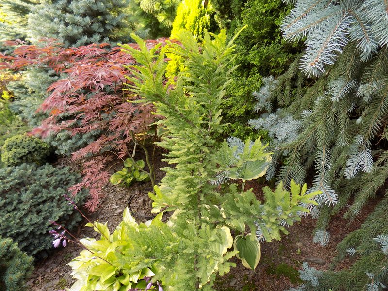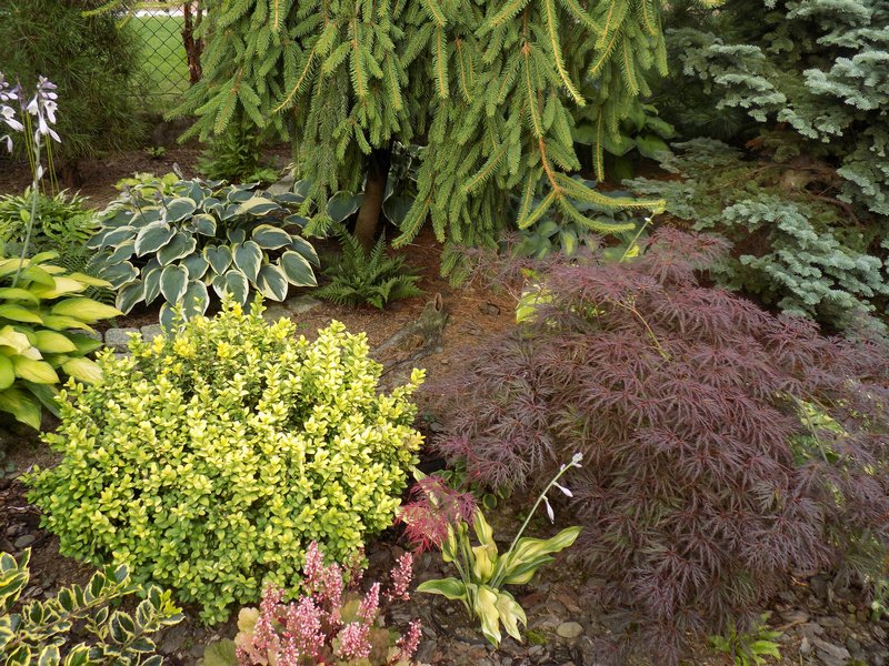 z założenia miał być to ogród w przewadze iglasty.Potem doszło trochę,liściastych,host i paproci.