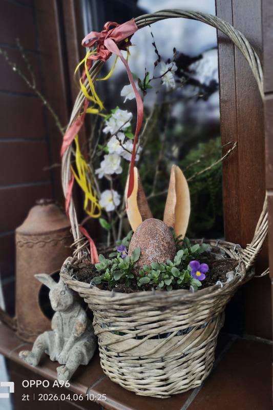 Czasami uda mi się kupić idealne białe jajka, wtedy nie farbuję, zawiązuję tylko cieniutkie wstążeczki z kokardkami, ale u nas zawsze do święcenia jajka były w skorupkach, tylko potem te skorupki trzeba było podsypać kurom, żeby nic święconego nie poszło do śmieci. Teraz wysypuję je na kompost.