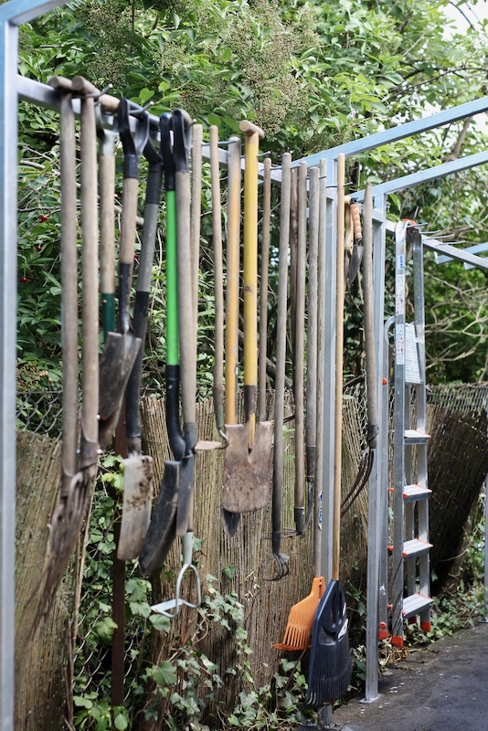 Mama mówiła, żeby w niedzielę nie robić, bo "niedzielna praca sie w gó....o obraca", ale nie wytrzymałam. Zwłaszcza, że Maciej robił konstrukcję od zadaszenia tyłu altany i pełno kabli, węży, obcięte gałęzie się wkoło walały. Teraz jakoś to wygląda. Zrobił mi wieszaki do narzędzi
