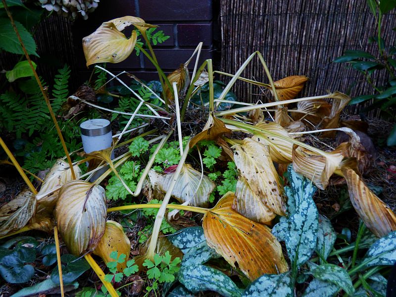 Części host już usunęłam liście i regenerują się po sezonie pod kołderką z kory i igliwia... część jeszcze się żółci w lepszej bądź gorszej formie.