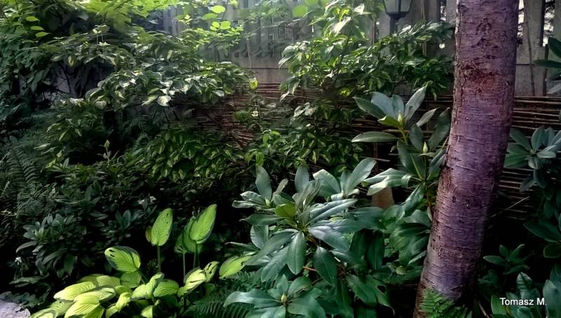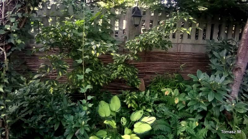 Druga myśl: może klonik palmowy czy japoński, jakiś bordowy dla kontrastu z borówką i (po)liliowymi badylami... tylko, czy są takowe z preferencję rośnięcia wzwyż a nie wszerz? Acz tu ewentualnie można by ciąć i formować