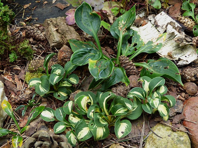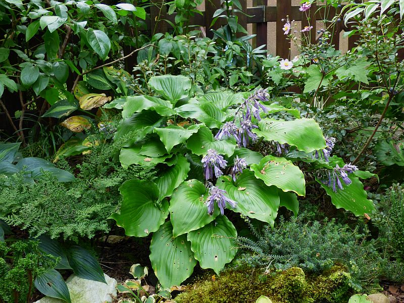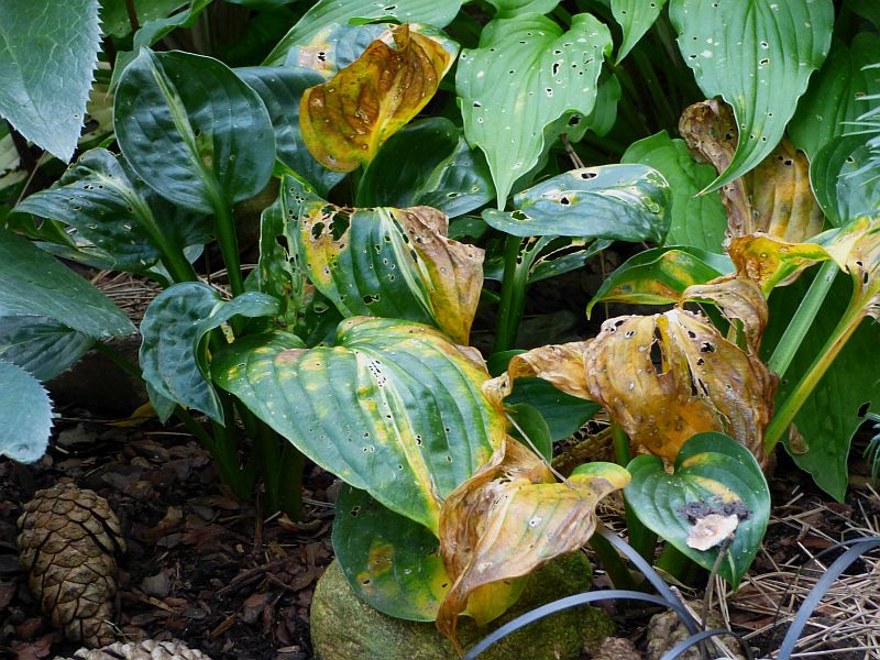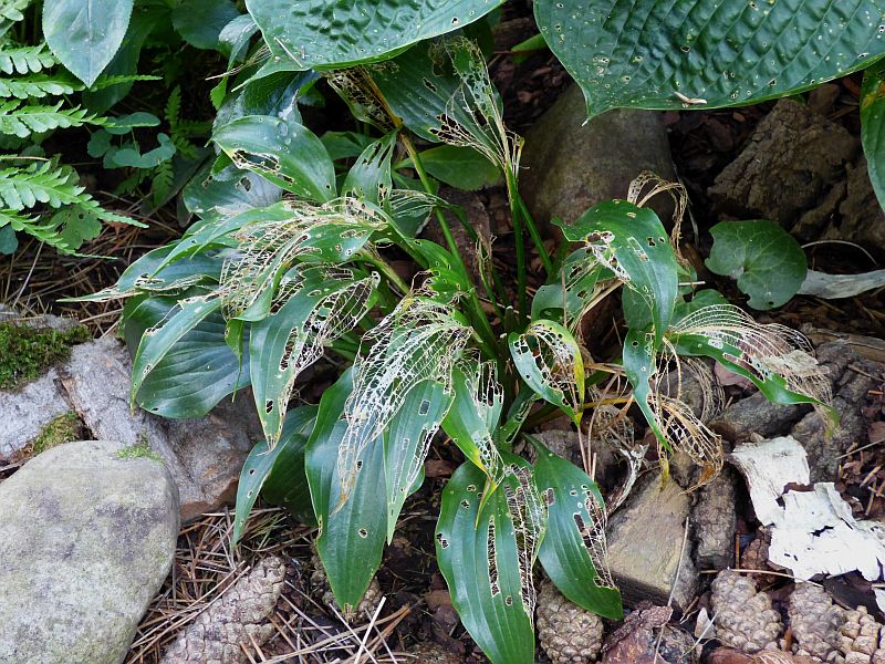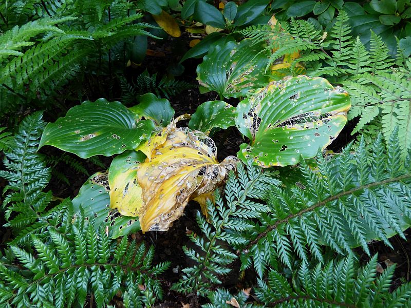 Hosta 'Grand Slam' też już urodą nie grzeszy... za sprawą ślimaków przede wszystkim