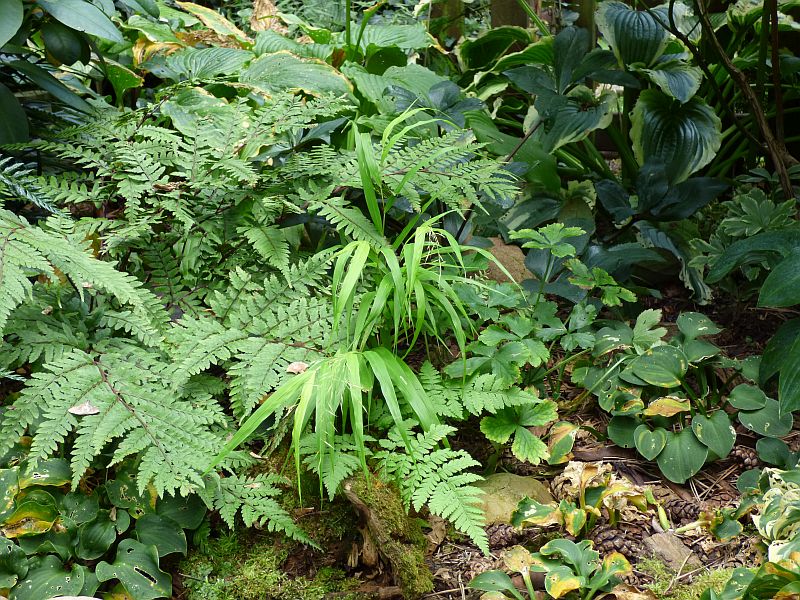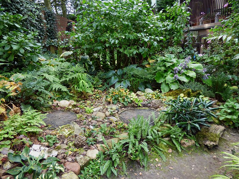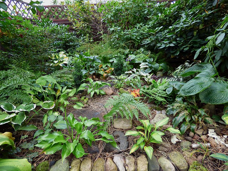 zatem mój ulubiony zakątek gdzie, nerecznica czerwonozawijkowa 'Prolifica' ściska się z cytromium Fortune'a, paprotnikiem 'Shiny Holly' i wietlicą uszkowatą 'Okanum'... jedynie adiantum powabne temu (u)ściskowi się wymyka... natomiast pozostają w nim hosty 'Snake Eyes' oraz 'Grand Slam', zjesienniałe w końcówce września w stopniu dość mocnym