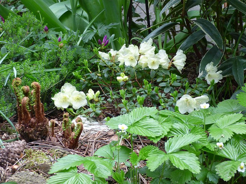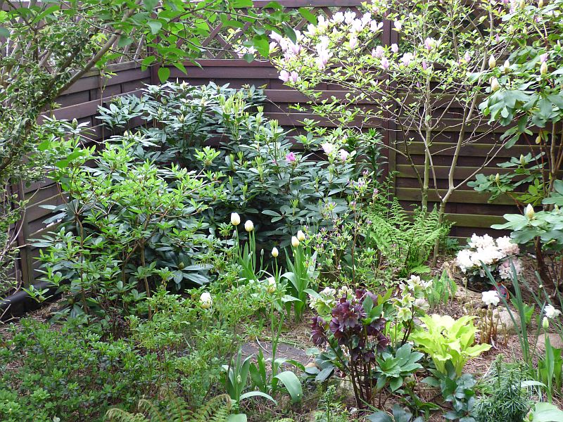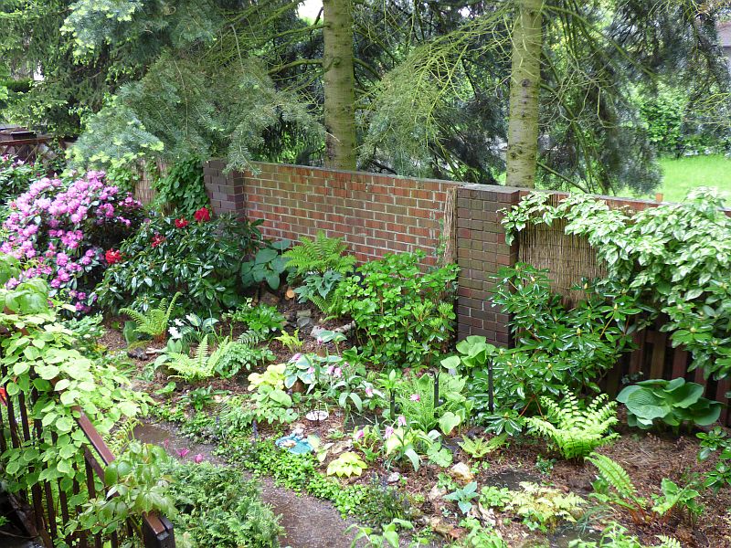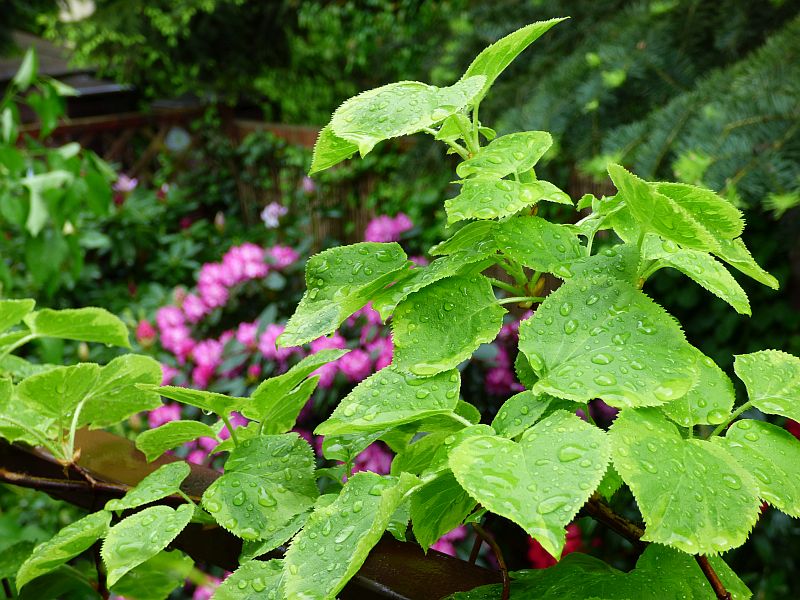 Rzeczona hortensja pnąca 'Mirranda' znalazła natomiast przystań po drugiej stronie i wije się po poręczy przy schodach z tarasu, zaś jej lipcowy brak urody nie rzuca się tak w oczy dzięki towarzystwu winobluszczu