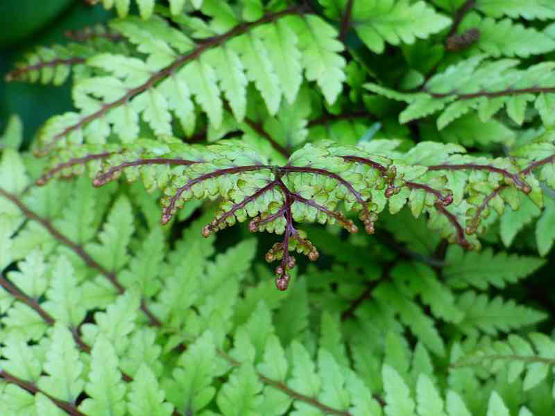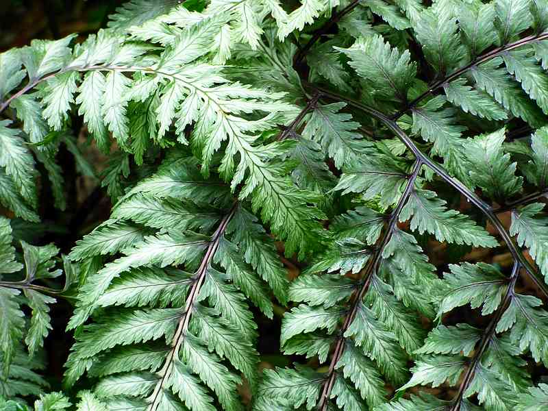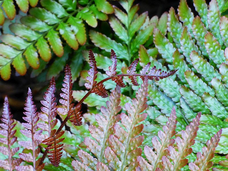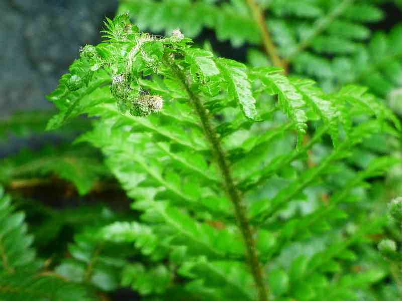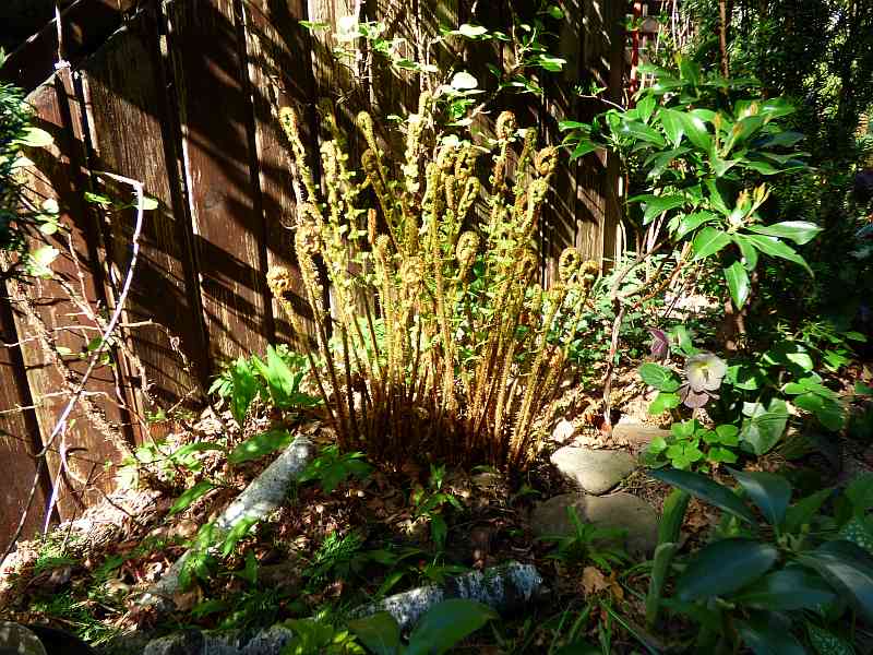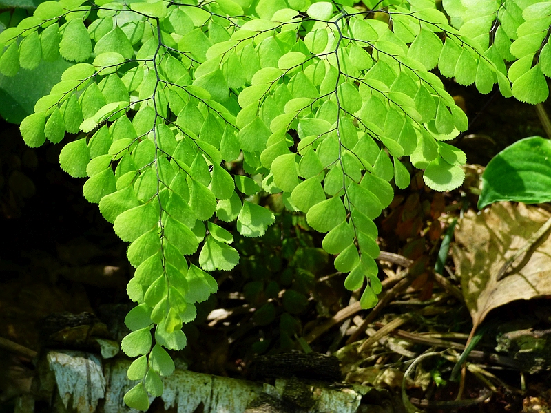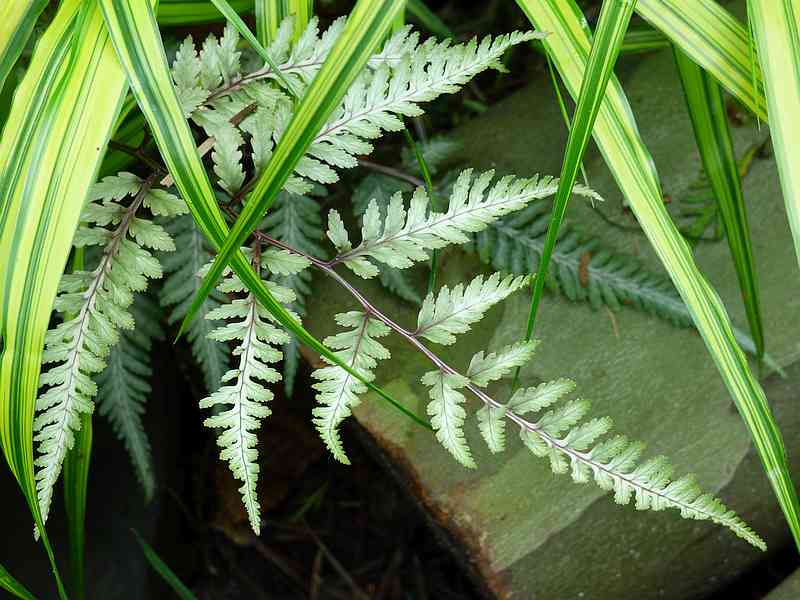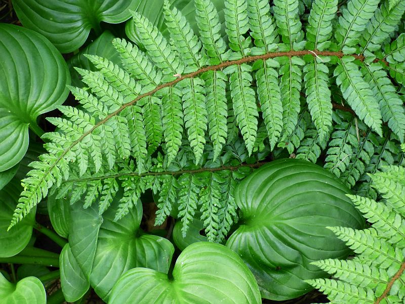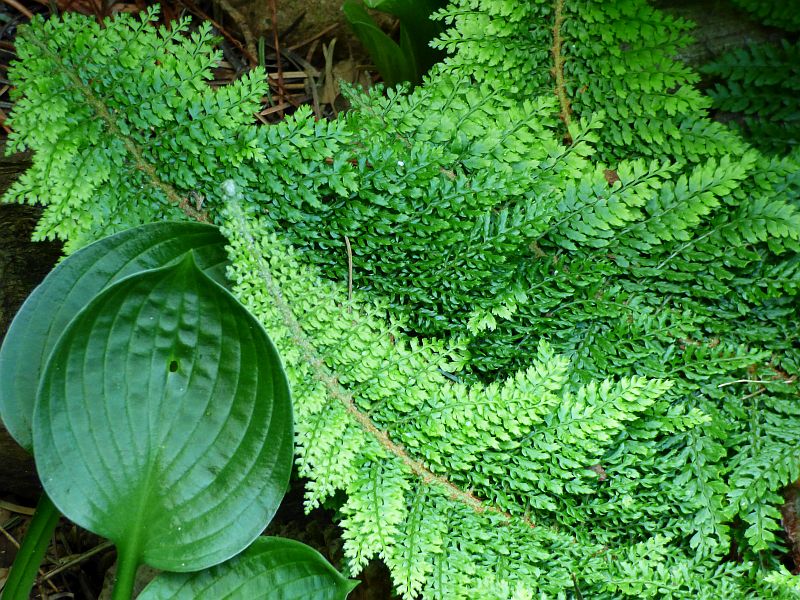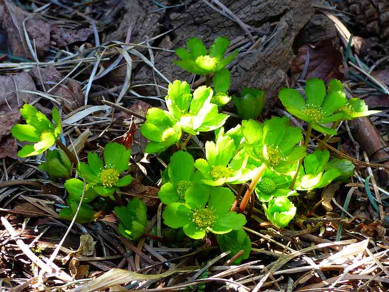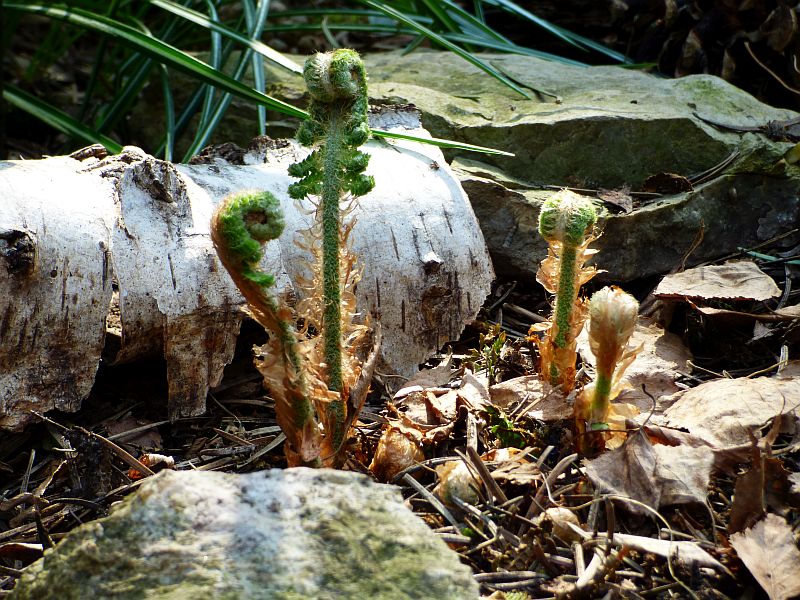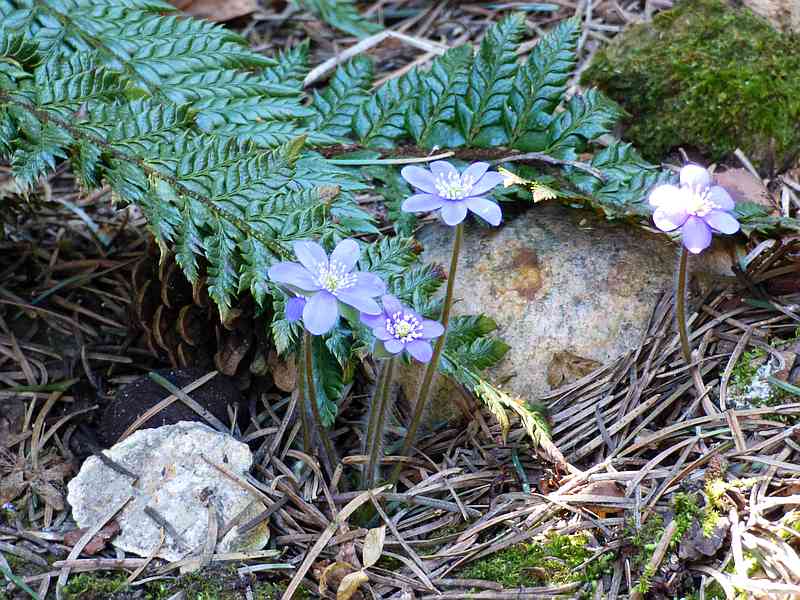 Przylaszczka pospolita na tle paprotnika 'Shiny Holy'