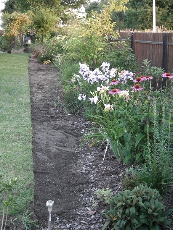 i podjęłam decyzję że znów trzeba zdzierać trawę i na tej czynności spędziłam sobotnie popołudnie, ale jeśli myślicie że powstała nowa rabata to się mylicie, ja jedynie, ku uciesze mojego M, wyrównałam rabatę przy ogrodzeniu, teraz będzie mu lepiej kosić, a ja zyskałam trochę miejsca na nowe nasadzenia, tak to teraz wygląda