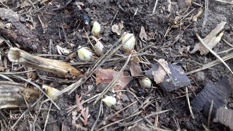 Rośliny w blokach startowych, cebulowe powoli przebijają się przez ściółkę, a nie mają u mnie lekko.