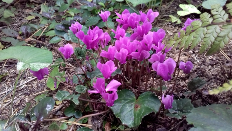 Przetrwał i ładnie zakwitł jeden cyklamen bluszczolistny NN, biały niestety nie przezimował, a może zanikł z powodu suszy.
