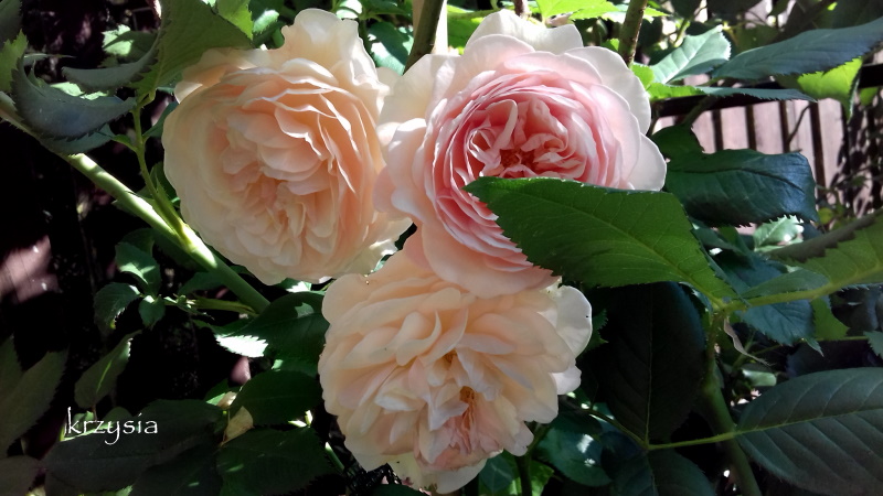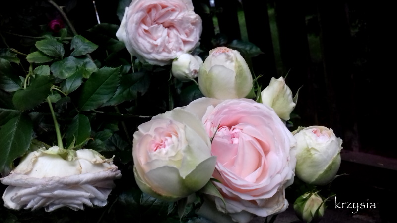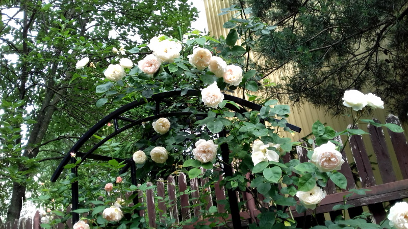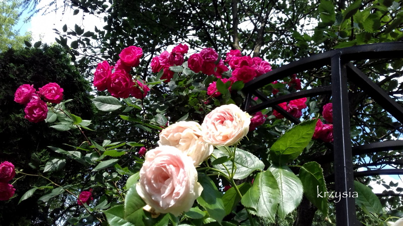 , edenka w tym roku słaba, choć kwiatów trochę miała, ta wyrośnięta jasna to Gentle Hermione, nie wiem dlaczego u mnie wyrosła na ponad 2 metry, nawet Sibercia się dziwiła, przeplotłam ją na górze łuku, trochę przycięłam i wypuściła boczne odrosty ku niebu. Kwitła nieźle, ale bardzo szybko