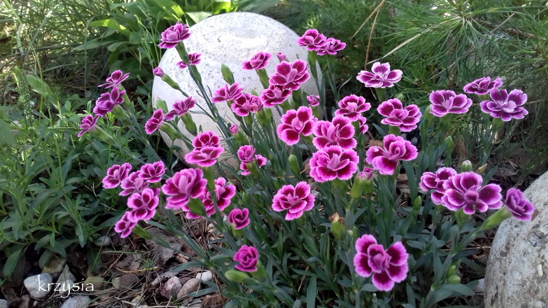 Goździk mnie zaskoczył, posadziłam go rok temu, jako jednoroczny wypełniacz, po pierwszym kwitnieniu coś go objadło, a wiosną wylazł i cieszy. Miałam jeszcze 4 inne kępy, rosły w innym, lepszym miejscu, w tym roku są tylko dwie i to bardzo marne, przymierzam się przenieść je obok tego kwitnącego.