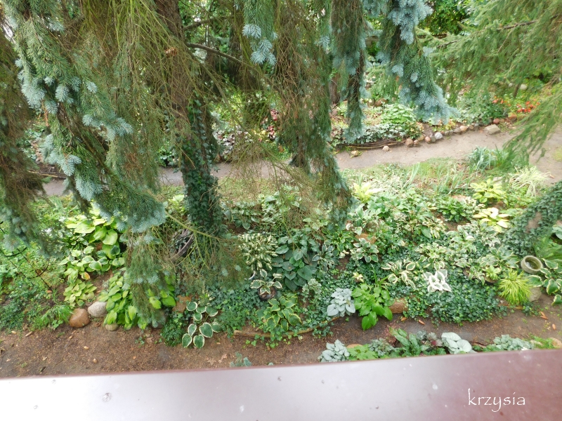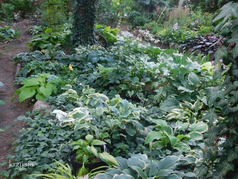 Środkową część, pomiędzy dwoma świerkami zajmują przede wszystkim hosty, większość w donicach, rośliną zadarniającą jest bluszcz zdjęty dwa lata temu z podpory przy tarasie, gdzie każdej zimy przemarzał, posadzony pod świerkiem rozpanoszył się błyskawicznie, czeka mnie ostre cięcie. Szybko też wspiął się na świerki.