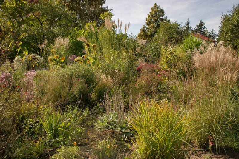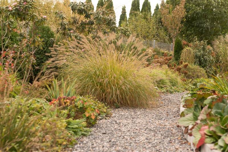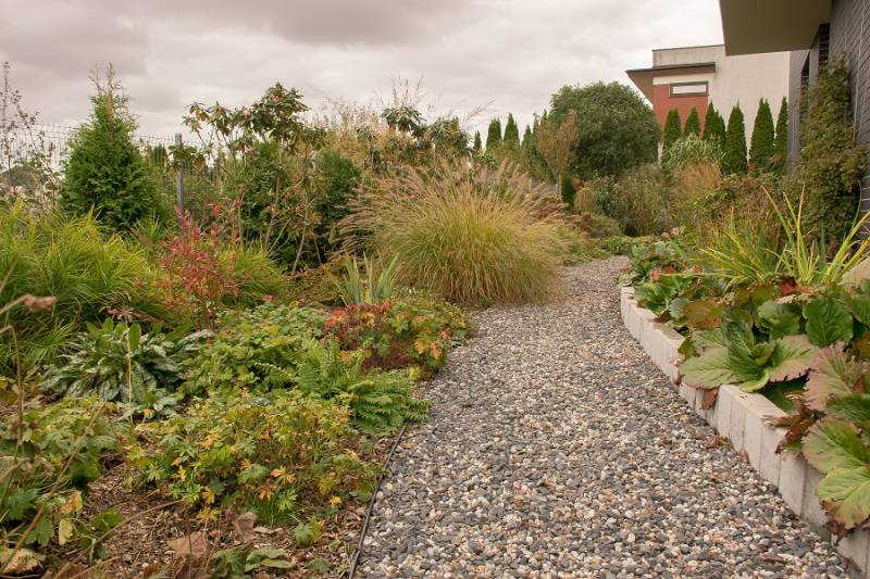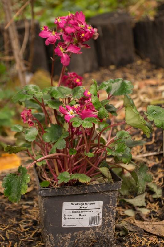 Wokół sosny powstała lekko podwyższona półcienista rabata. Tu parzydło paprocie, rodgersje, saruma, epimedium. Może odżyje rodek smirnovi, który jeszcze nigdy nie kwitł.