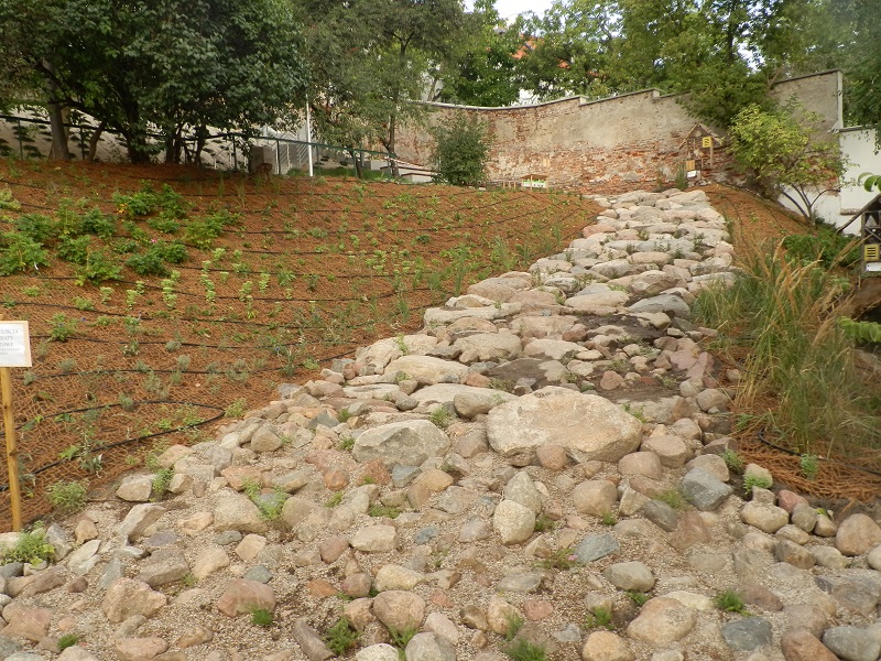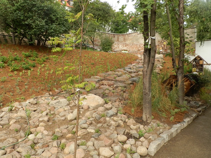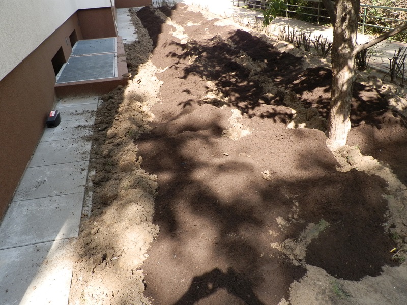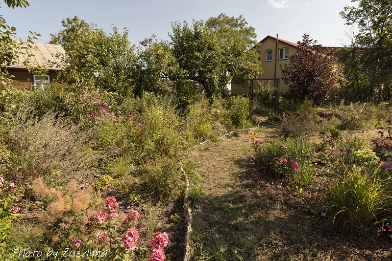 Tu autorska (po prawej) oraz stosunkowo nowa rabatka w sadzie.