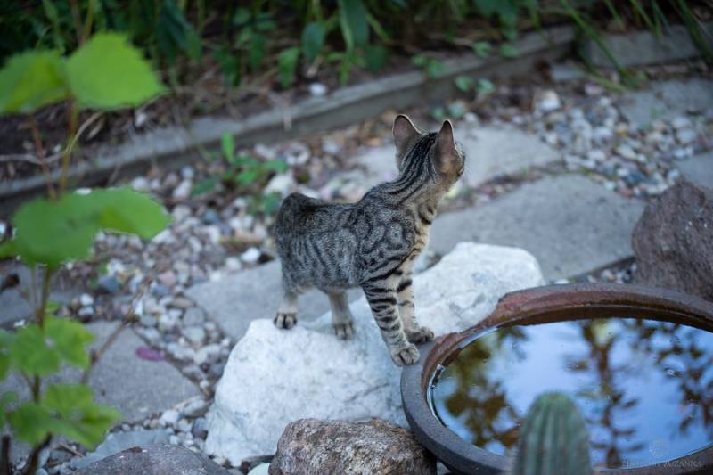 Miły, wesoły (czasem do szaleństwa) ale niebywale grzeczny, w ogrodzie sobie wariuje, ale na wołanie przybiega. Co jest bezcenne na wsi, ponieważ zapanowanie nad kocią ciekawością w tych krzakach na wsi spędzało nam nieco sen z powiek.