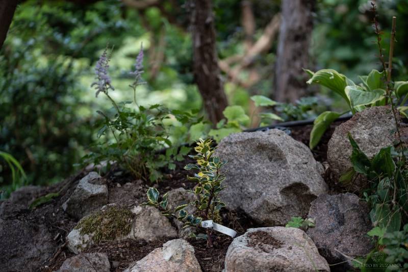 W tym sezonie postanowiłam doprowadzić pseudo skalniak do jakiej takiej kultury i na raty wyrywam kożuch konwalii i podagrycznika od razu obsadzam może nie typowymi roślinami skalniakowymi, ale takimi co wytrzymają półcień. Oczywiście najpierw solidnie przygotowuję podłoże przy pomocy kompostu z obornika. Na wierzch daję zrębki