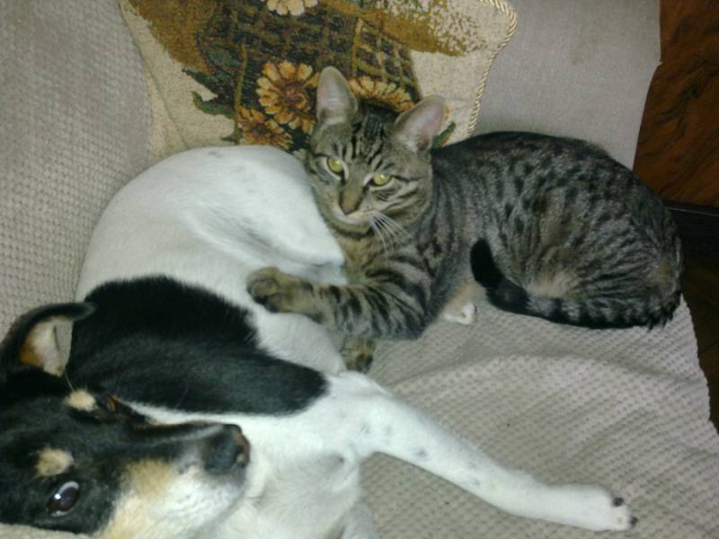Wiesiu kot panoszy się niemiłosiernie. No i chce się za wszelką cenę z Zębasem zakumplować. Ostatnio była próba przytulania i wspólnego spania na fotelu, ale Zębas po kilku błagalnych spojrzeniach rzuconych w moim kierunku, zwiał :D
