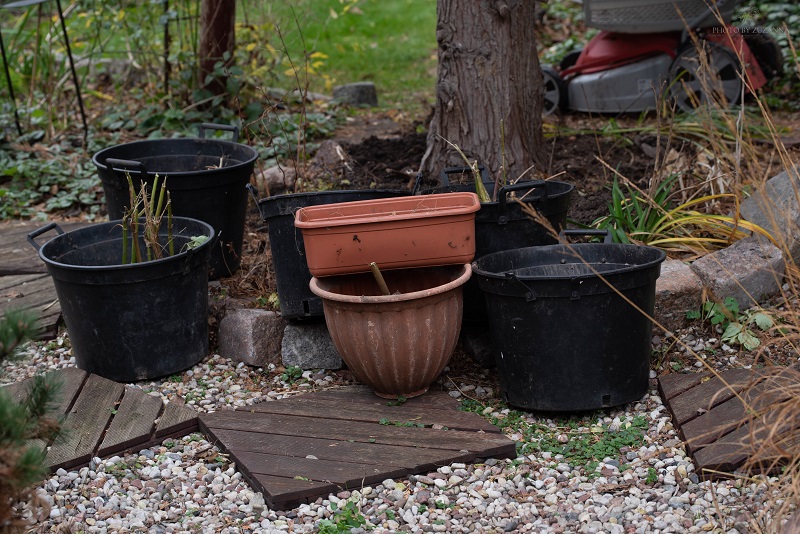 Z dwóch donic wywaliłam karpy dalii i postawiłam do obsuszenia. Tam, gdzie roślinności nie było, wywaliłam ziemię, sypnęłam drenaż i uzupełniając ziemię sadziłam wiosenne cebulki z różności ze skrzynek W., im większe tym głębiej. Ustawiłam pod bramą te donice, które mają stanowić ozdobę ogrodu na wiosnę, pozostałe ustawiłam z boku, mając nadzieję że oczekująca roślinność wreszcie znajdzie swoje miejsce na wsi lub w ogrodach klientów. Zagrabiłam żwirek, którym wysypany jest placyk, zmiotłam liście i poszłam za dom i tam także opróżniłam większość donic z daliami.