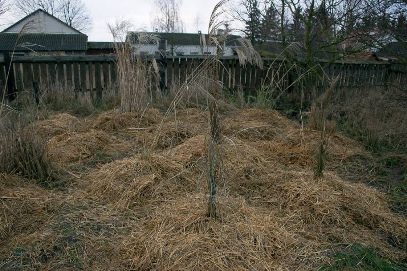 Przybyło nam traw... głównie miskantów, które W. powtykał, gdzie się dało. Z braku lepszego pomysłu i materiału wyściółkował wszystko starą słomą ze stodoły.